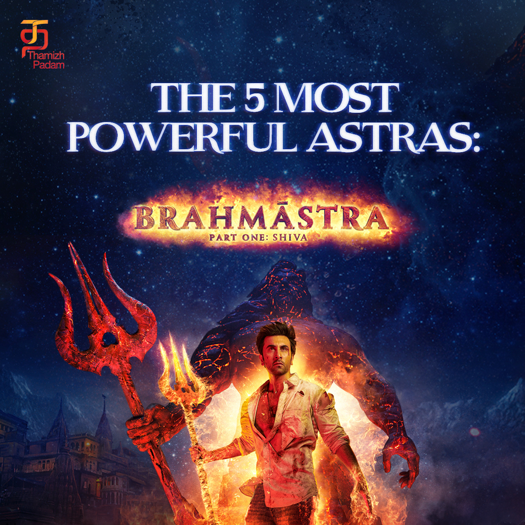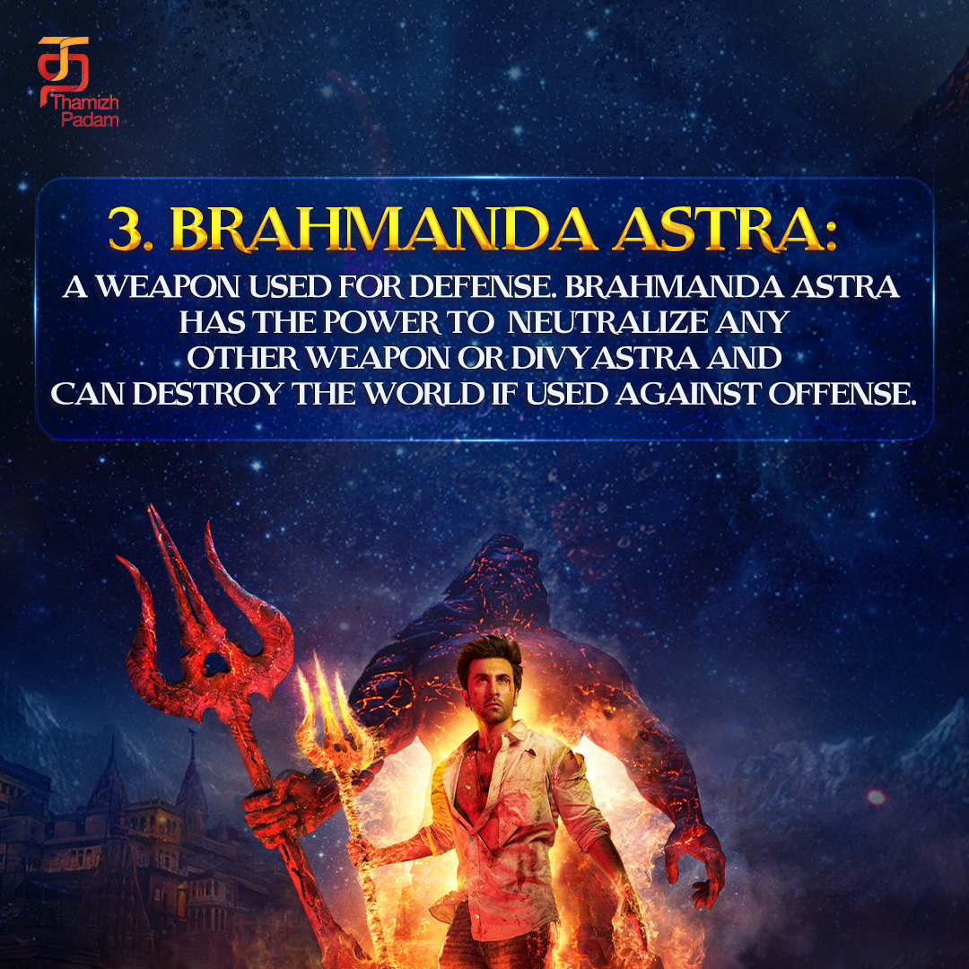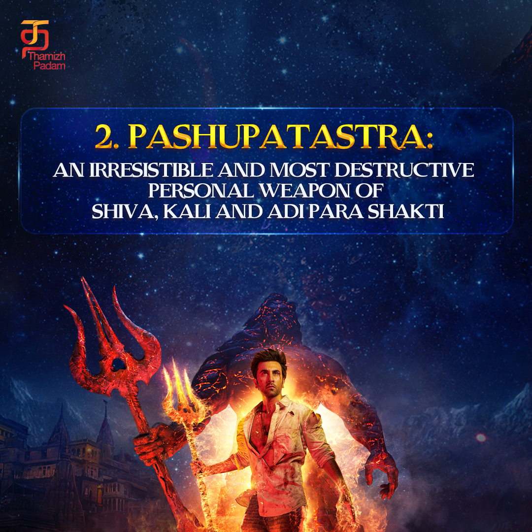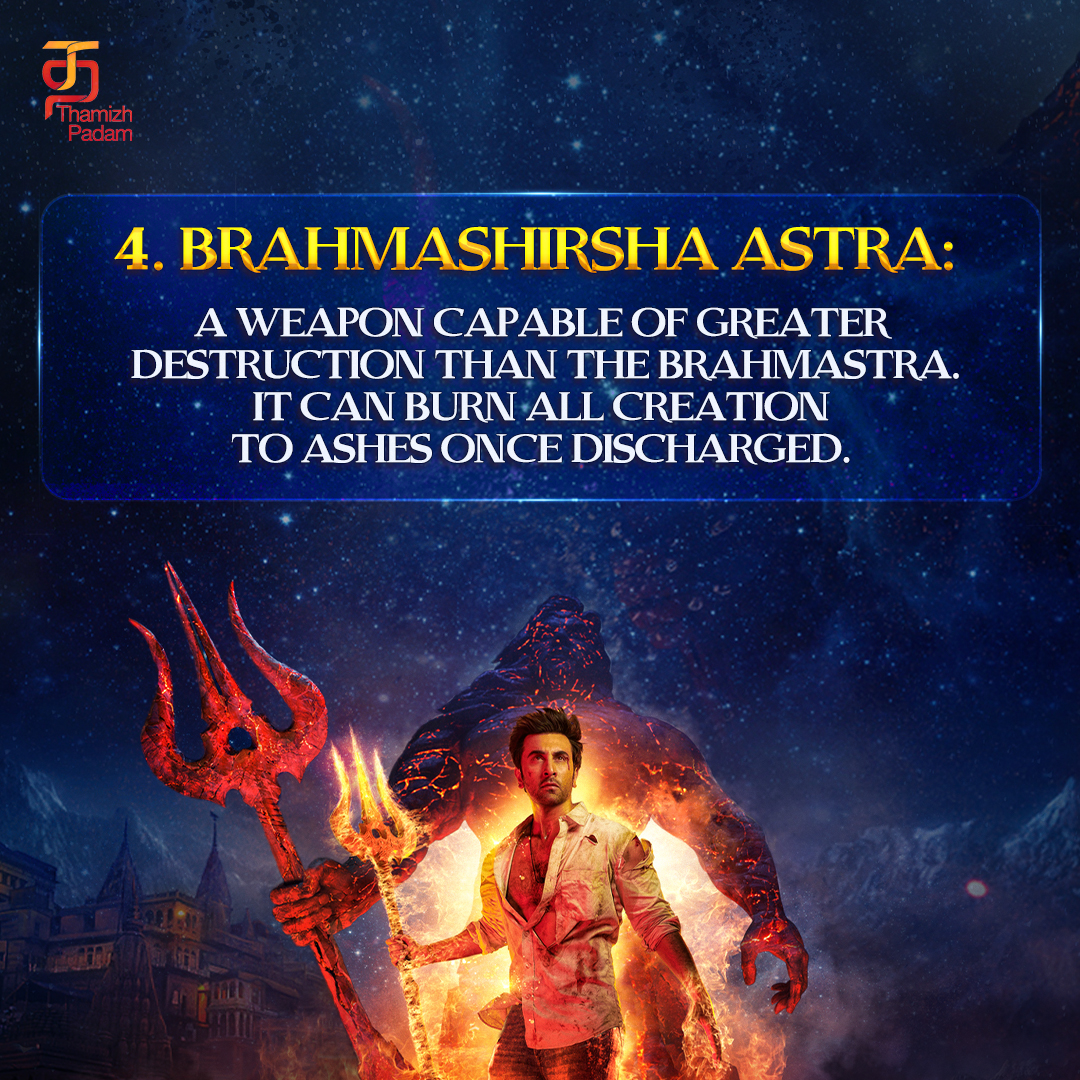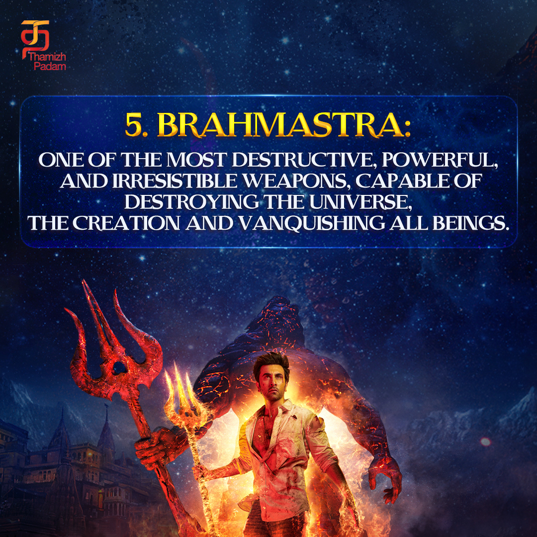 5. பிரம்மாஸ்திரம்: பிரபஞ்சத்தை அழிக்கும், அனைத்து உயிரினங்களையும் உருவாக்கி அழிக்கும் திறன் கொண்ட, மிகவும் அழிவுகரமான, சக்தி வாய்ந்த மற்றும் எதிர்க்க முடியாத ஆயுதங்களில் ஒன்று.